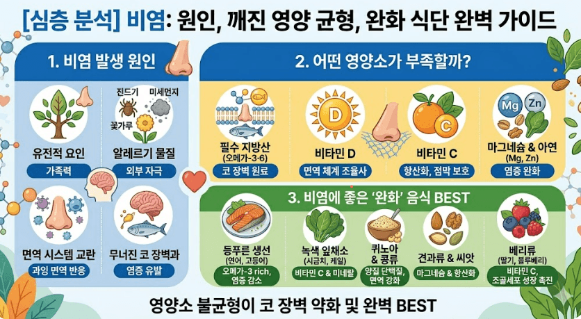 특정 영양소 결핍은 코 점막의 방어력을 낮추고 면역 과민 반응을 강화시켜 비염을 악화시킵니다.