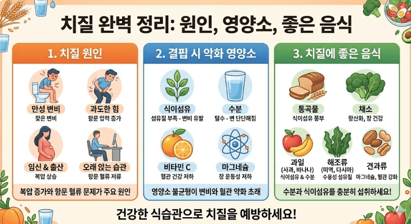 치질은 한국 성인 3명 중 1명이 경험할 만큼 흔한 질환입니다. 하지만 부끄러움 때문에 방치하는 경우가 많죠. 이 글에서는 치질이 생기는 정확한 원인, 어떤 영양소가 부족할 때 위험한지, 그리고 일상에서 쉽게 실천할 수 있는 식이요법까지 한번에 알아보겠습니다.